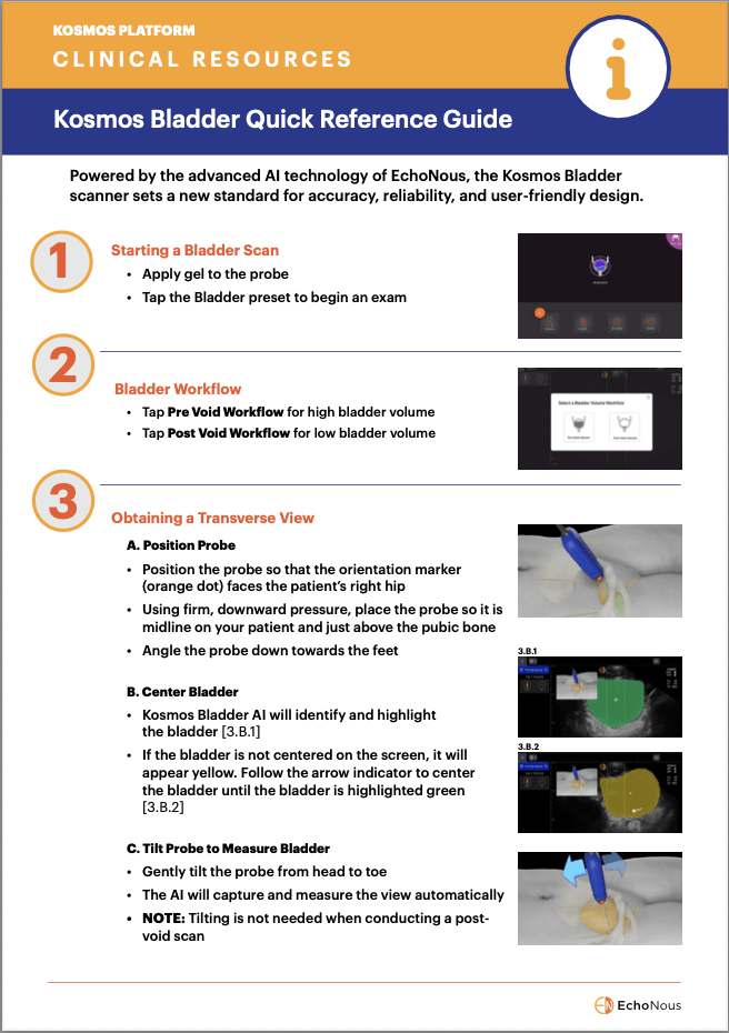 Download step-by-step instructions for performing bladder scans using Kosmos Bladder. The guide covers the complete workflow including proper probe positioning, patient preparation, and measurement techniques.